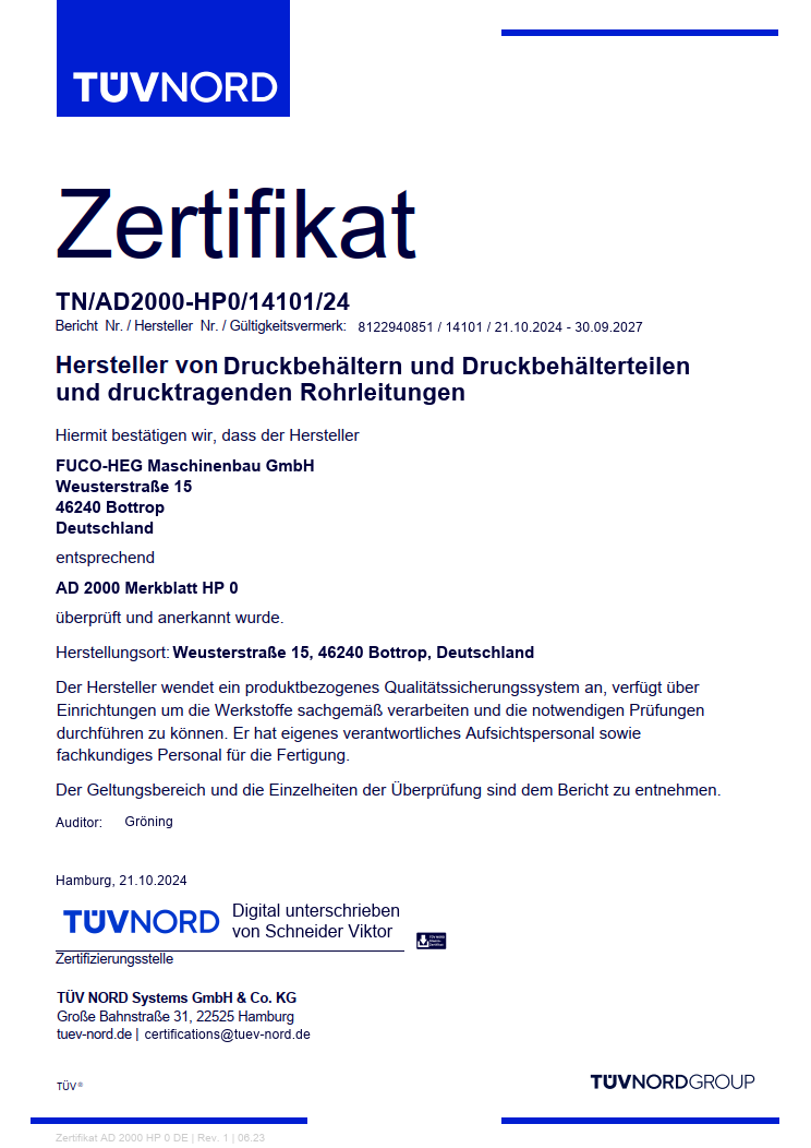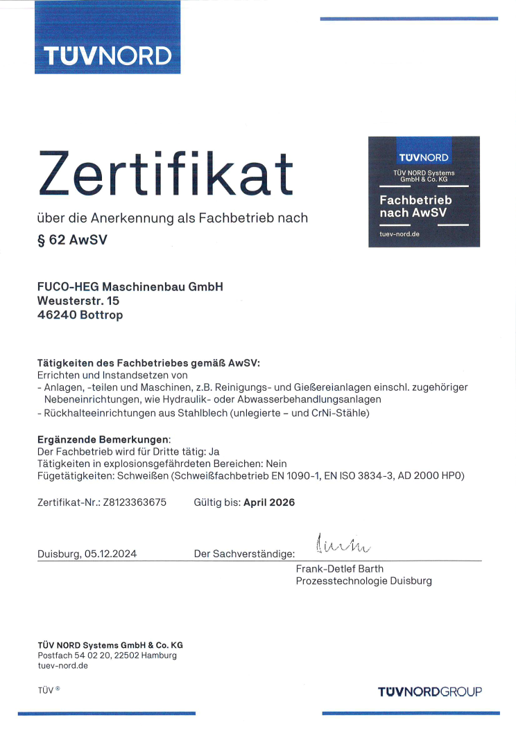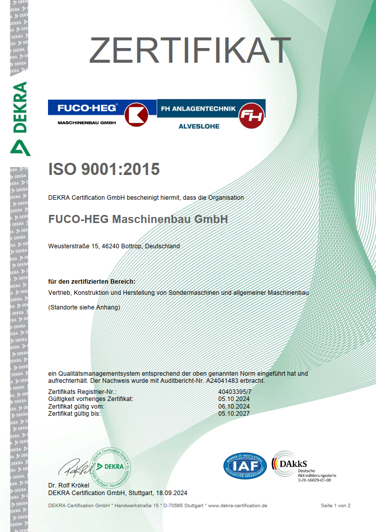 Global Certification Network Association und DEKRA Certification Services bescheinigen FUCO-HEG Maschinenbau GmbH die Einführung und wirksame Anwendung eines Qualitätsmanagementsystems entsprechend DIN EN ISO 9001 für die Bereiche: Entwicklung, Konstruktion und Herstellung von Maschinen und Sonderanlagen. Das Qualitätsmanagement unterliegt der regelmäßigen freiwilligen Überwachung.