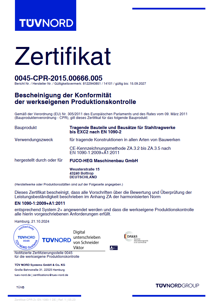Außerdem ist unsere werkseigene Produktionskontrolle vom TÜV nach DIN EN 1090-2 zertifiziert.